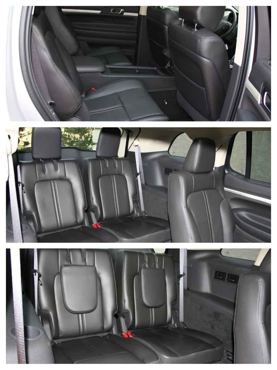 Both cars have two adjustable bucket seats for the second row. They’re very comfortable and move forward, backward and recline. In the Flex, they’re heated – the Lincoln offers heated AND cooled second row seats. The second row is very spacious in both cars – tons of headroom, as well as space to stretch out. The MKT adds manual sunshades for both rear door windows. Both cars have a button on the rear edge of the door opening – pressing it flips the second row seatback down and tumbles the whole thing forward automatically, opening a space to get to the back row.