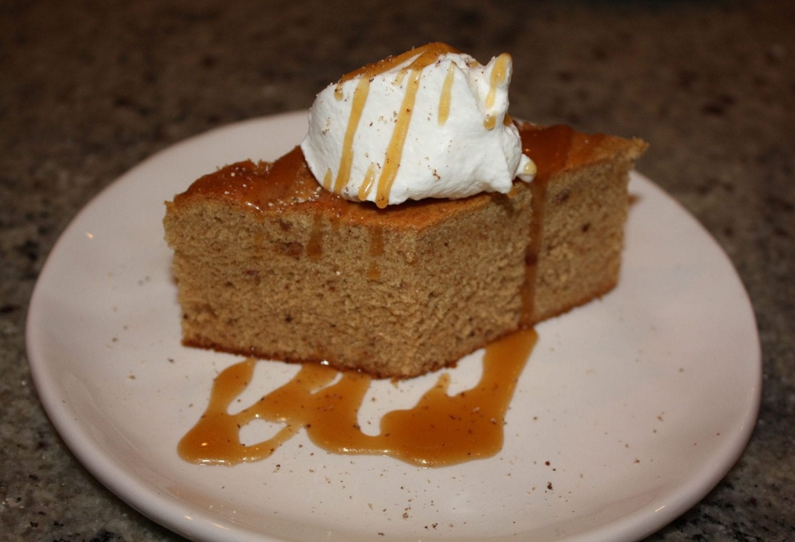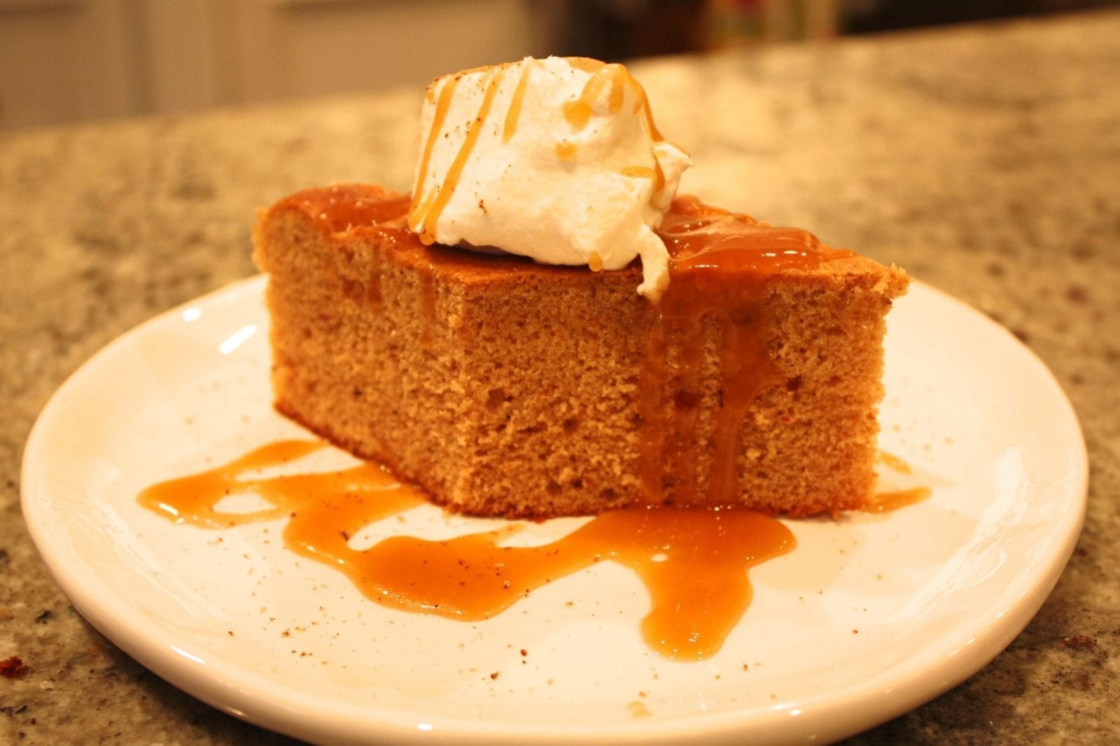 Now you can add the eggs, the vanilla (c’mon, be generous with the vanilla!), the spices, your home-made self-rising flour (go ahead and brag about that to your friends) and the salt – all into the food processor – and process it until it’s smooth. You’re making batter. We have a dough blade for our food processor, but have never bothered to use it – the processing blade does a wonderful job here. When it’s smooth, just spoon the entire thing into your prepared pan, and bake your “pudding” for about 30 minutes. The key here is that it’s nice and golden and has risen properly.